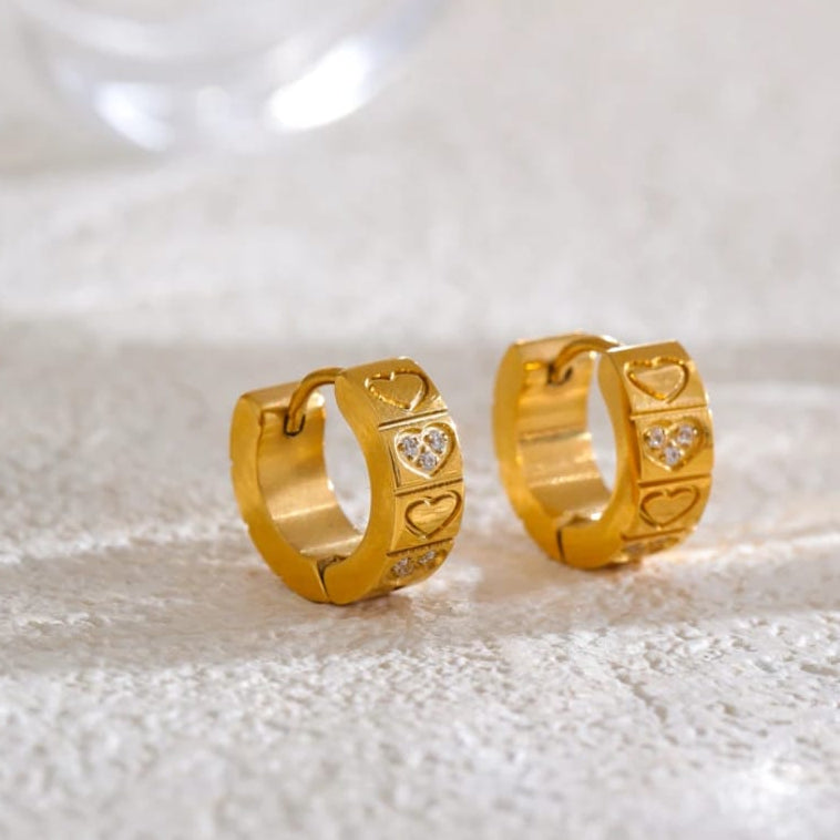 The Crystal Heart Huggies are a sweet statement of everyday love and shine. Crafted from durable stainless steel and finished with a thick layer of 18k gold plating, these chunky huggies feature engraved heart motifs, some filled with sparkling cubic zirconia for a touch of playful luxury. Their smooth, polished surface and secure hinge clasp make them comfortable enough for all-day wear while still delivering that eye-catching glow.