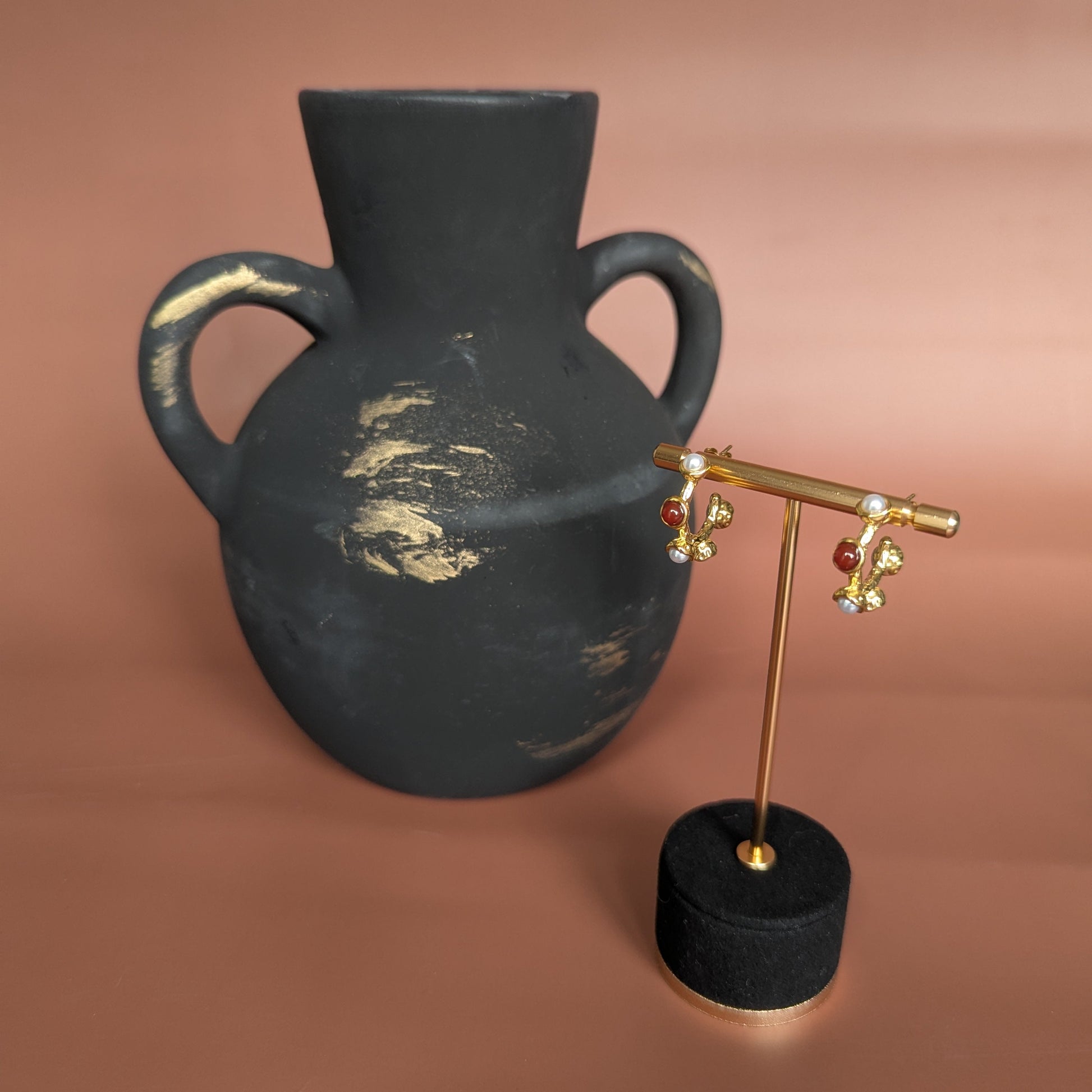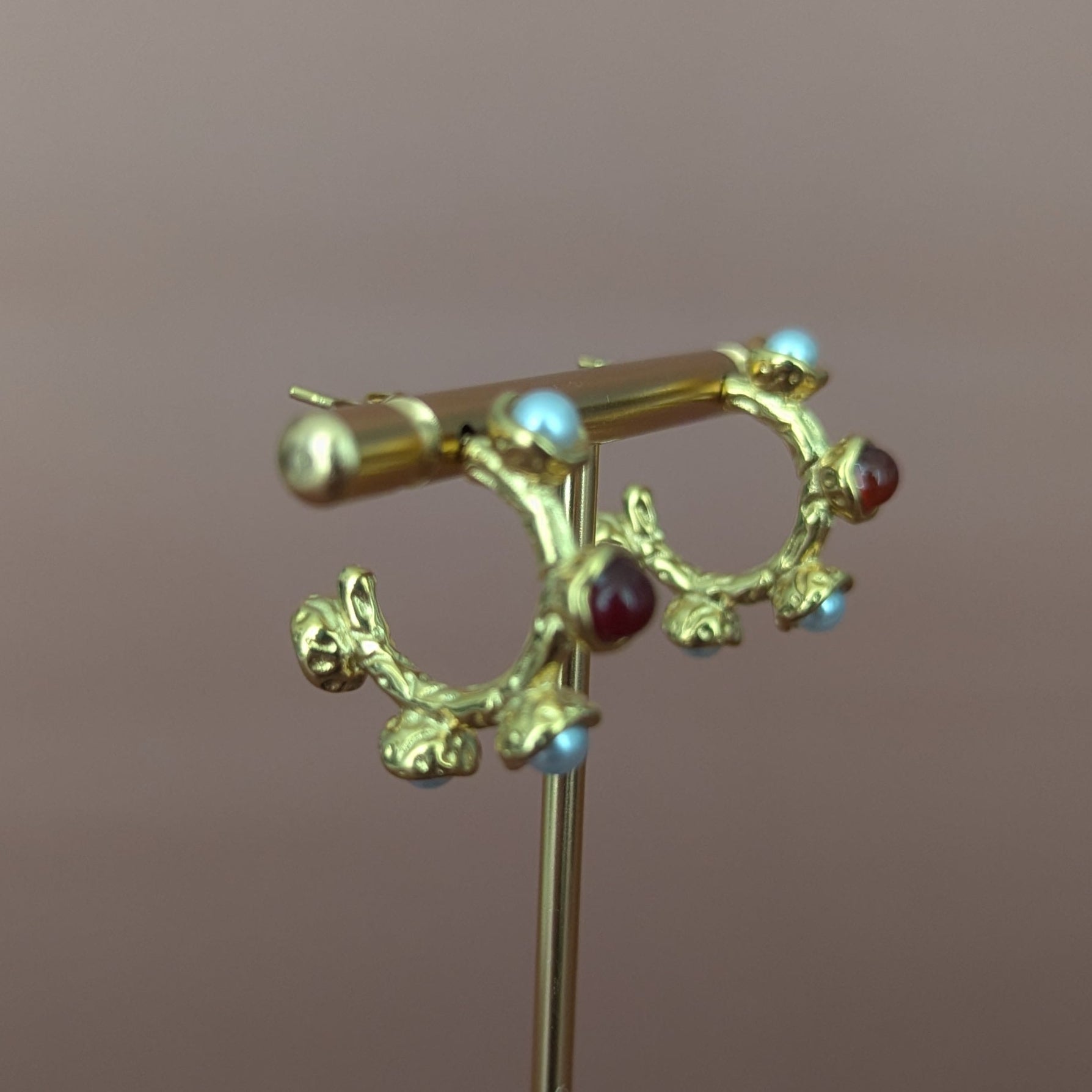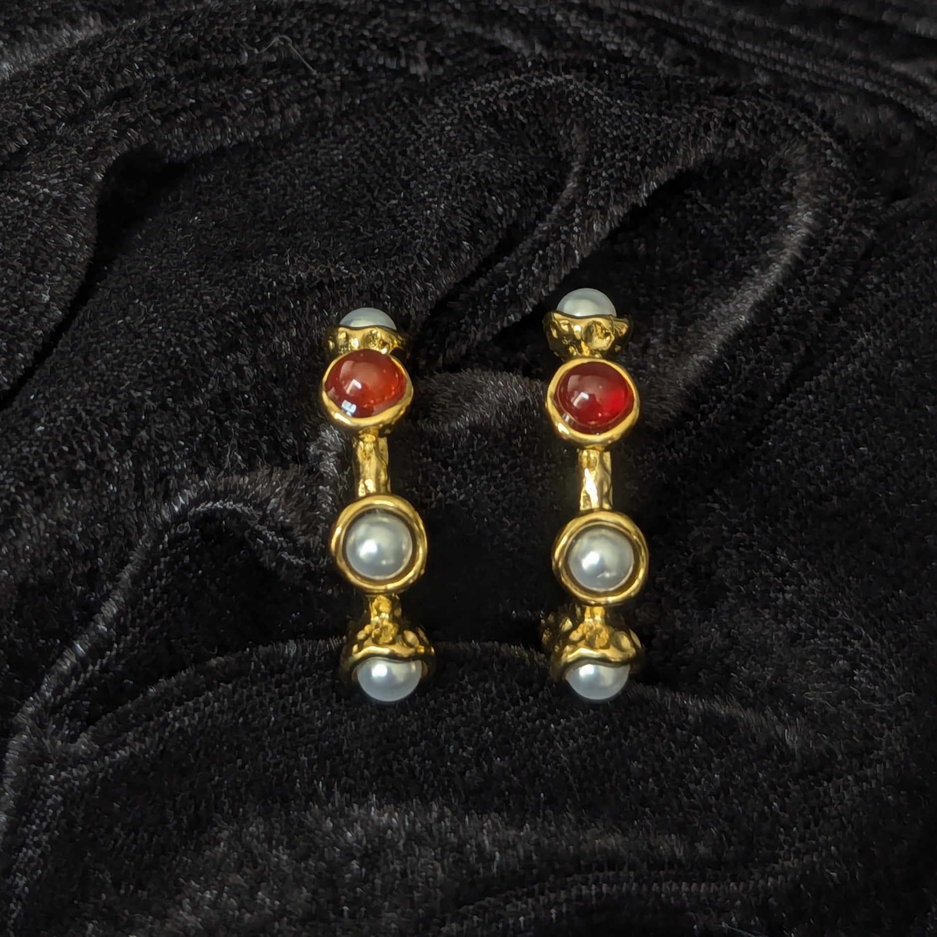 These gold hoop earrings feature a sculptural, branch-like design accented with glossy red and white beads. A bold and playful pair that brings color and texture to any look.