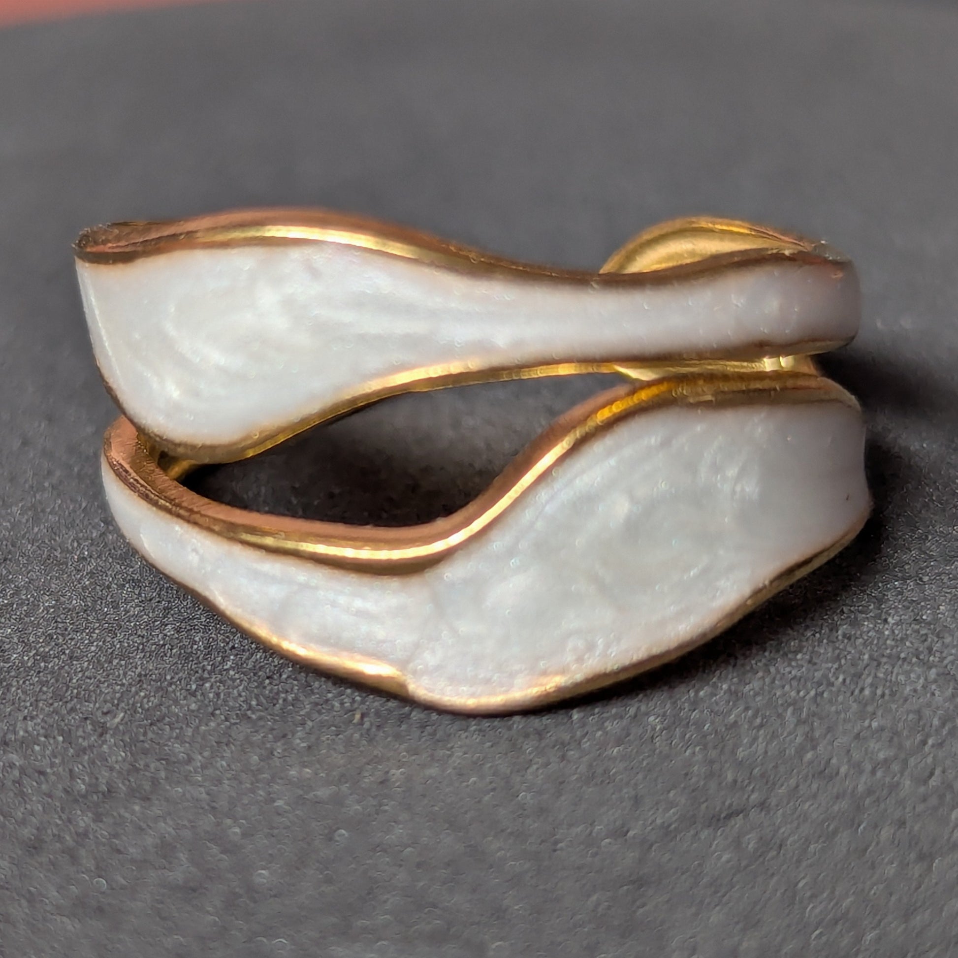 This elegant ring with cutout wave-like design is available with black or white enamel detail. Perfect and comfortable to wear day or night.