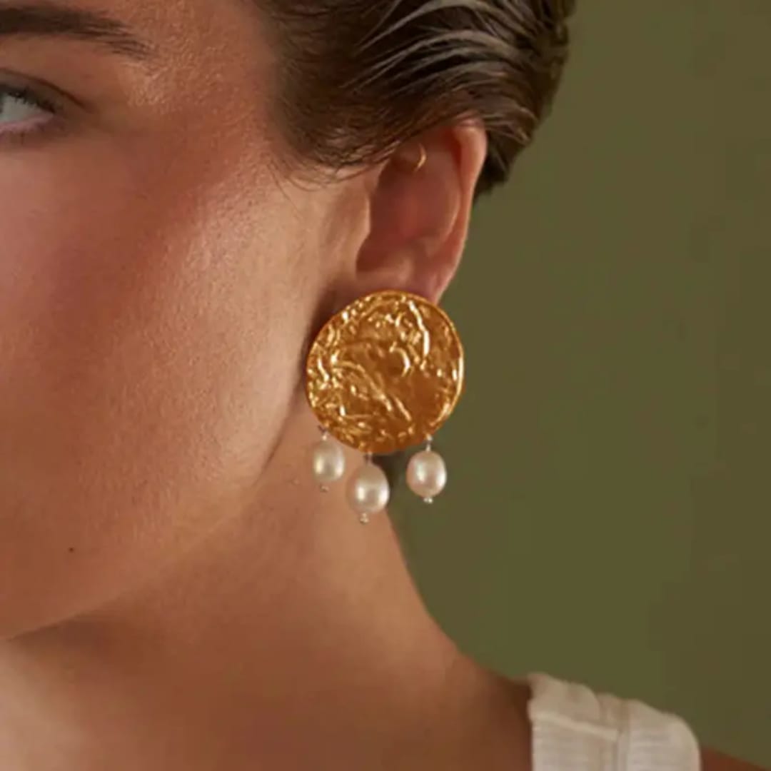 Our Nicola Earrings feature bold hammered gold discs adorned with a row of 3 dangling freshwater pearls.