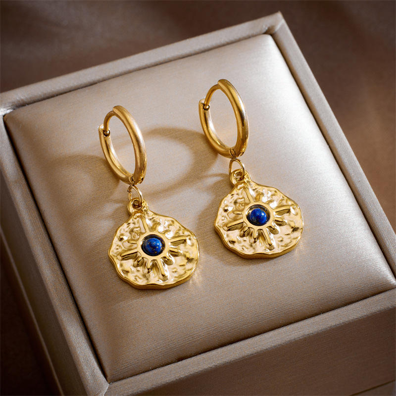 Our Stella Blue Earrings feature a hammered textured background with a star, featuring an enamel blue stone adornment.