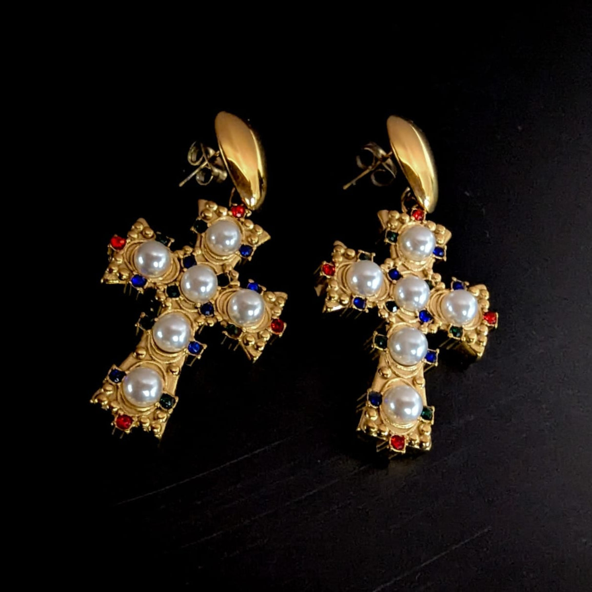 These ornate cross earrings feature faux pearls and colourful gemstone detailing, set in an antique-style gold frame. Available with either a hoop or teardrop fastening, they offer a bold, vintage-inspired statement with a touch of baroque flair.